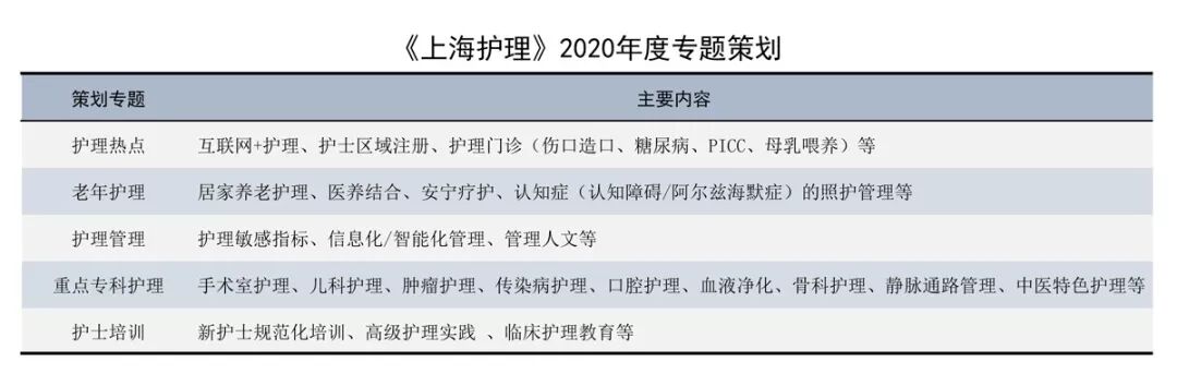 为了进一步聚焦行业热点、促进护理学科发展,更好地服务于作者和读者,2020年《上海护理》杂志拟重点策划如下主题,欢迎广大读者关注并踊跃投稿。