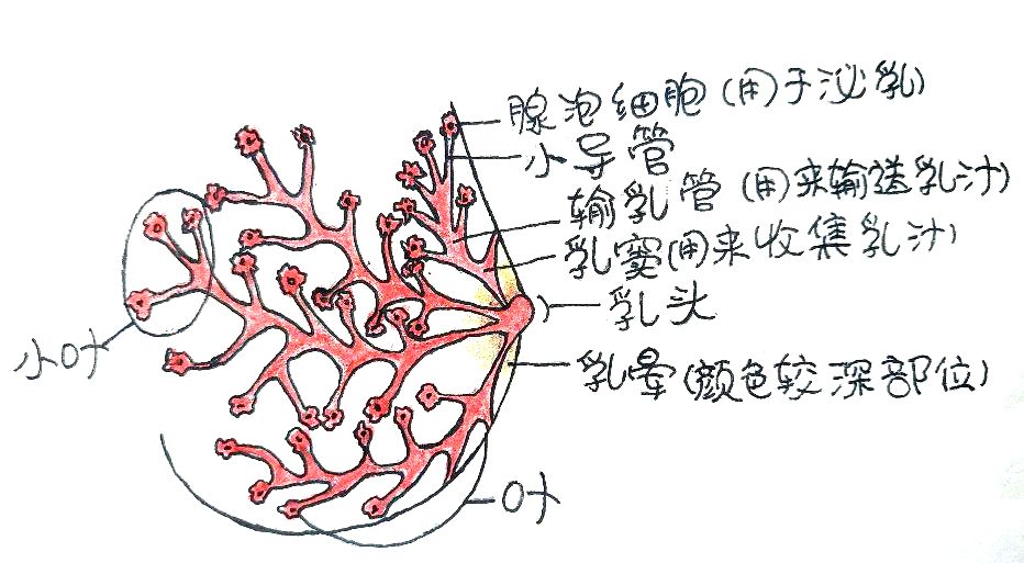 乳汁的产生,来源于乳腺腺泡,产生的乳汁通过乳腺导管运输出来,储存在乳窦中。妈妈哺乳时,宝宝口腔挤压乳窦,使乳汁通过乳头进入口腔,这样宝宝就吃到母乳了。