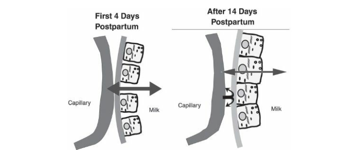 在婴儿出生前2—3天,这时候的乳汁很少,颜色较深,称为初乳。这时乳腺腺泡之间的间隙是非常宽敞的,药物容易进入到乳汁,但由于初乳量是很少的,所以不必过度担忧;两个星期以后,乳汁量增多,颜色变浅,这时的乳汁称为成熟乳,乳腺腺泡之间的间隙就会关闭,形成血乳屏障,可以阻止大分子药物的进入。