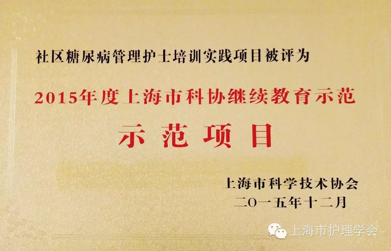 近日,上海市科学技术协会公布了2015年度上海市科协继续教育示范项目名单。由世界造口治疗师协会授权、上海市护理学会和上海交通大学护理学院联合举办的“国际造口治疗师培训课程项目”荣膺“2015年度上海市科协继续教育优秀示范项目”;由上海市护理学会和上海市社区卫生协会联合主办、上海市卫生和计划生育委员会支持的“社区糖尿病管理护士培训实践项目”获得2015年度上海市科协继续教育示范项目。